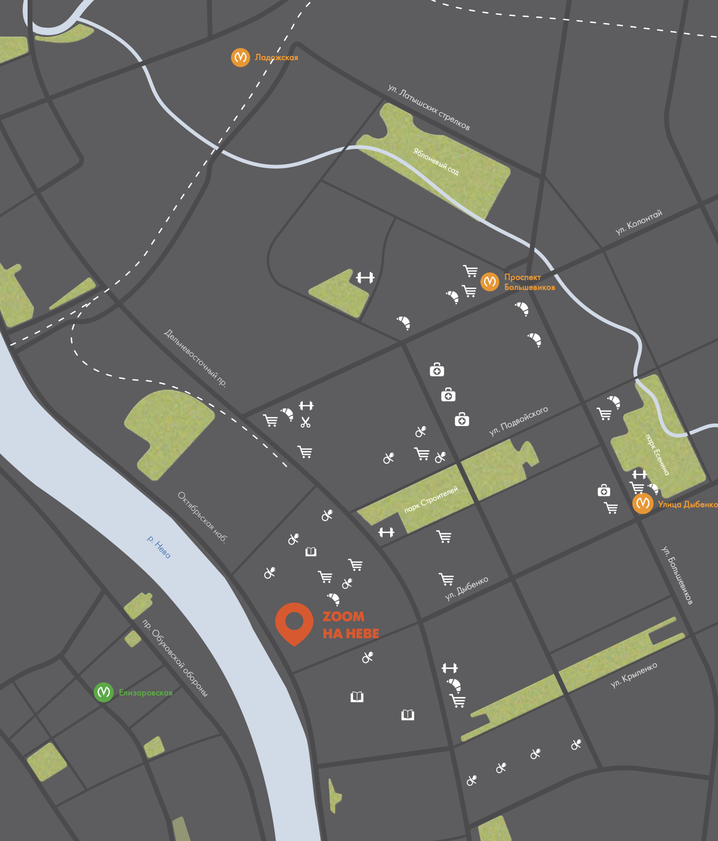 Набережная Невы находится в буквальном смысле в минуте ходьбы от комплекса. Здесь вы можете прогуляться вдоль реки, посидеть у воды с друзьями или прокатиться на велосипеде.